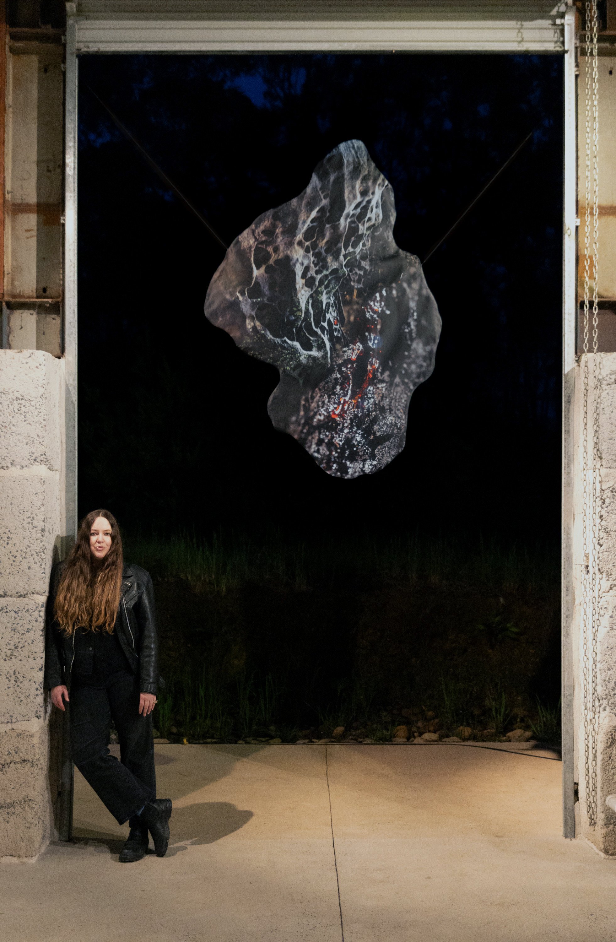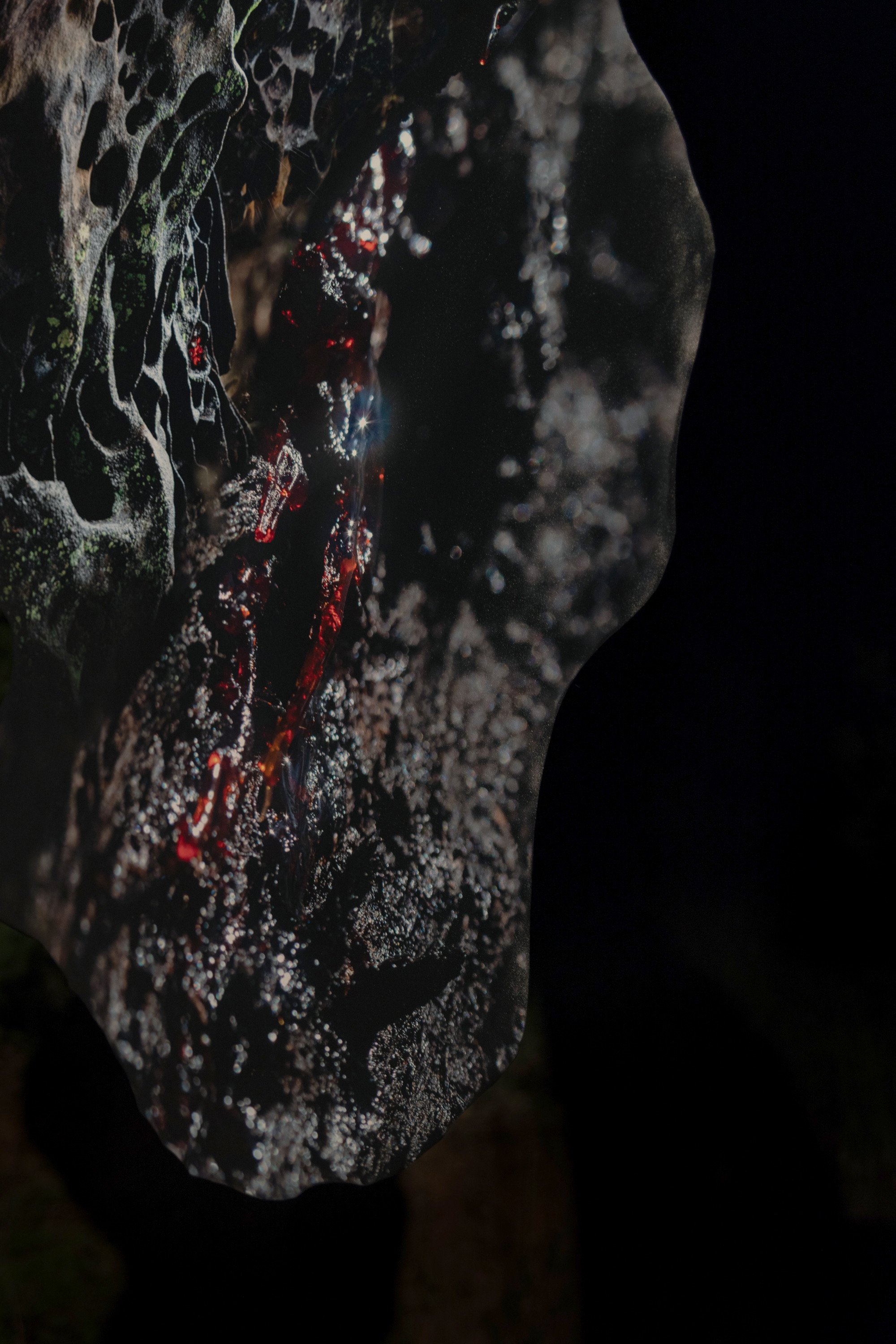 Ruby red sap is produced by wildfire-resilient eucalypt species abundant in the Wollemi. Sandstone erosions, specifically four-million year old perforations called tafoni, are found in cave overhangs throughout the landscape. My photographs of these phenomena were taken just before and after the full Blood Moon eclipse of March 2026, and became the core images for this hanging sculpture.